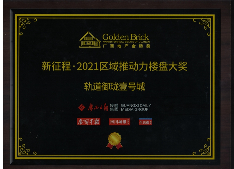 •  軌道御瓏壹號城項目獲得廣西地產(chǎn)金磚獎“新征程·2021區(qū)域推動力樓盤大獎”