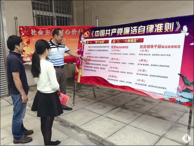 為增強學習貫徹的自覺性、主動性,把學習貫徹與具體工作實際結(jié)合起來,公司紀檢監(jiān)察室在第一時間進行宣傳貫徹。一是以短信形式,向公司全體黨員和中層以上干部發(fā)送2期《廉政知識學習卡》短信,并就“妄議中央”、“老鄉(xiāng)會、校友會、戰(zhàn)友會”、“四類人員不得買賣股票”、“社會主義核心價值觀”等內(nèi)容分4次發(fā)送短信進行解讀,以最快捷的方式、最簡潔的字句讓黨員干部及時了解和知曉《準則》和《條例》的關(guān)鍵內(nèi)容;二是組織黨委中心組成員集中專題學習;三是制作四版《準則》和《條例》宣傳版報,分別布置于二樓、三樓辦公走廊;四是為全體黨員訂購人手一份《中國共產(chǎn)黨廉潔自律準則、中國共產(chǎn)黨紀律處分條例、中國共產(chǎn)黨章程》單行本,全部發(fā)放到每一位黨員手中,要求原原本本、逐字逐句認真學習;五是在公司OA信息系統(tǒng)黨務(wù)紀工團門戶發(fā)布通知學習。