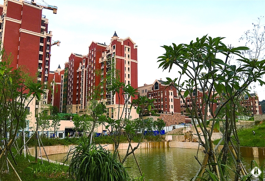 邕城青山腳下的翡翠灣紅墻玉瓦,雨后緋紅的磚墻好像玫瑰的孤傲,又似海棠嬌羞,微光中映襯著濕地公園的水汽,氤氳中陶醉羞紅了晚霞。