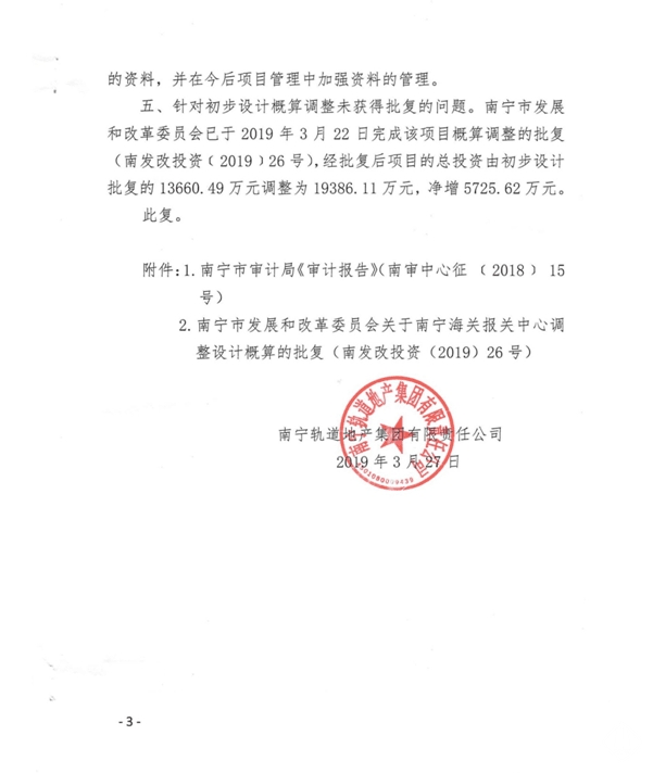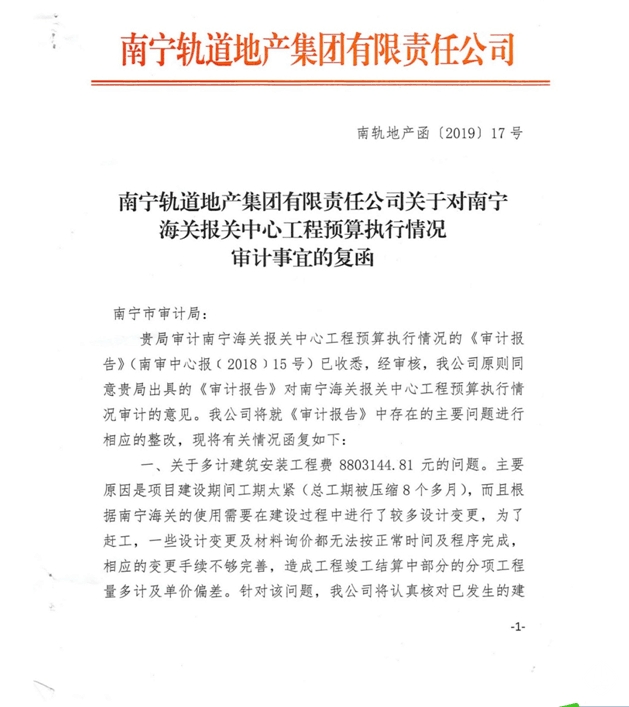 南寧軌道地產(chǎn)集團(tuán)有限責(zé)任公司關(guān)于對南寧海關(guān)報(bào)關(guān)中心工程預(yù)算執(zhí)行情況審計(jì)事宜的復(fù)函