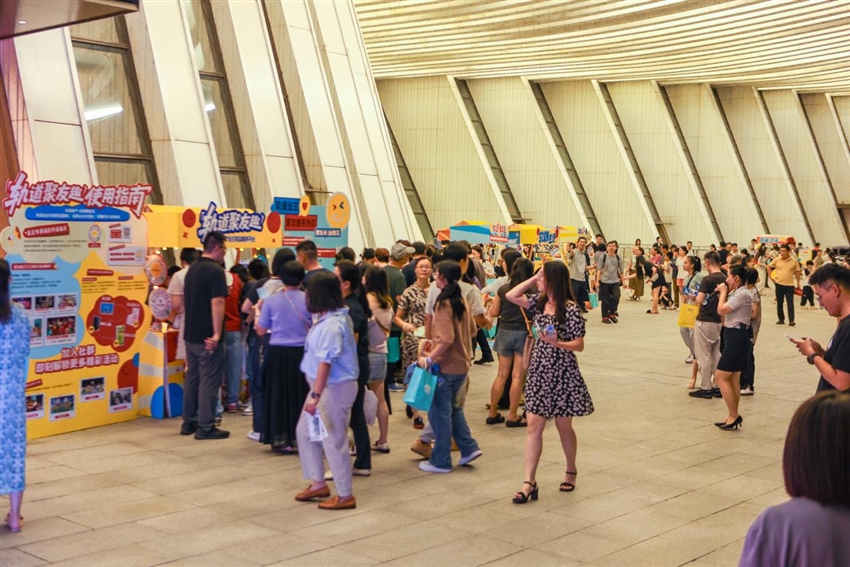 “軌道聚友趣嘉年華”4大游戲互動(dòng)的現(xiàn)場,大人孩子排起長隊(duì)參與,在歡聲笑語中收獲定制扇子、飲用水等精美禮品;蔚來汽車展區(qū)科技感十足,吸引眾多業(yè)主駐足體驗(yàn)。